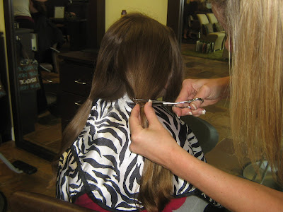 Madelyn has been asking for quite some time to get her hair cut....short. Daddy, of course, likes long hair and was not too keen on the idea, at least not for it to be super short. After Madelyn told me, again this weekend, that she wanted to get her hair cut I remembered the Locks of Love organization. This is from their website: "Locks of Love is a public non-profit organization that provides hairpieces to financially disadvantaged children in the United States and Canada under age 18 suffering from long-term medical hair loss from any diagnosis." I explained to Madelyn that this would be a great opportunity for her to help other kids, especially since she wanted to get her hair cut and they needed hair! 10 inches is the minimum requirement. Here are the pictures from this evening.